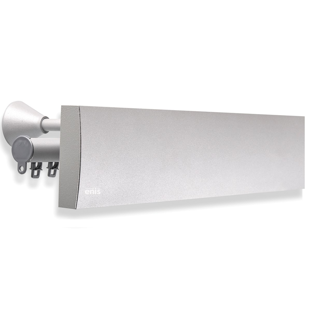 Μεταλλική μετόπη για κουρτίνες με διπλό στρογγυλό σιδηρόδρομο σε χρώμα γκρι. Κατασκευάζεται σε οποιαδήποτε διάσταση επιθυμείτε κατόπιν παραγγελίας και κόβεται στα μέτρα σας.