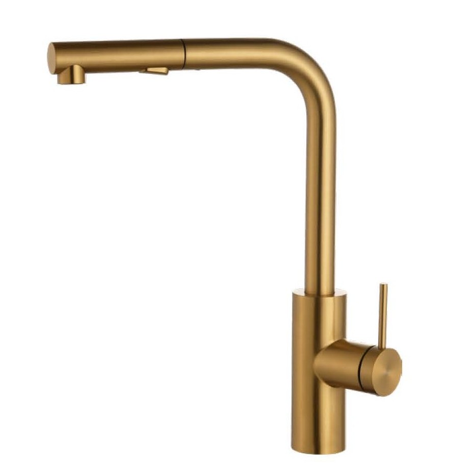 Μια ιδιαίτερη Μπαταρία κουζίνας με άκρως μοντέρνα και minimal σχεδιασμό σε Χρυσό Ματ τελικό επίθεμα με ορειχάλκινο κορμό και αποσπώμενο τηλέφωνο με σπιράλ 2 λειτουργιών βροχή και ντους. Διαθέτει 39cm Ολικό ύψος και πλάτος ροής νερού 23.7cm. Το φινίρισμα της μπαταρίας διαθέτει ειδική επίστρωση PVD, μια φυσική εναπόθεση ατμών που αυξάνει κατά πολύ την διάρκεια ζωής του προιόντος.