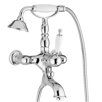 Μπαταρία Λουτρού Oxford της ιταλικής εταιρίας Bugnatese σε Χρώμιο φινίρισμα από υλικό κατασκευής ορείχαλκο με πορσελάνινο λευκό χερούλι. Στην συσκευασία περιλαμβάνεται το τηλέφωνο μαζί με άθραυστο σπιράλ μήκους 1.5 μέτρου.