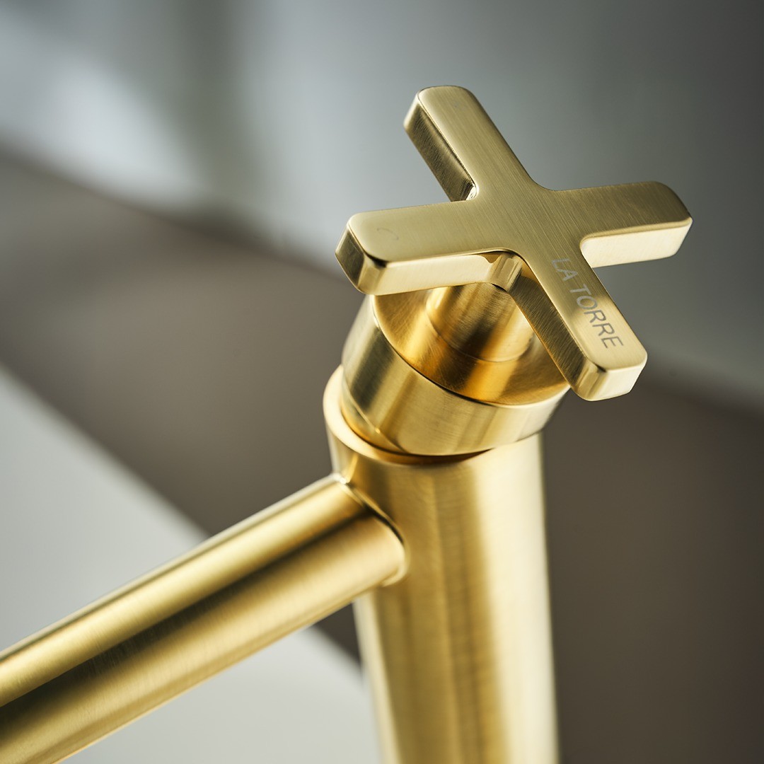 Μια επιβλητική σειρά από τον Ιταλικό Οίκο La Torre που καθηλώνει τον θεατή από την πρώτη κιόλας ματιά. Η μπαταρία νιπτήρος Elle Cross διαθέτει αντί για το συνηθισμένο κλασσικό χερούλι, ένα σταυρό μοχλό για την ρύθμιση της θερμοκρασίας και της ποσότητας του νερού δημιουργώντας έτσι σε όλο το μπάνιο μια ιδιαίτερη industrial και συνάμα αρχοντική αισθητική. Διατίθεται σε Gold Brushed φινίρισμα και είναι κατασκευασμένο εξ' ολοκλήρου στην Ιταλία από 100% ατόφιο ορείχαλκο άριστης ποιότητας. Διαθέτει Ολικό Ύψος 16.5cm με ύψος ροής νερού 9.5cm και ολικό πλάτος 15.3cm.