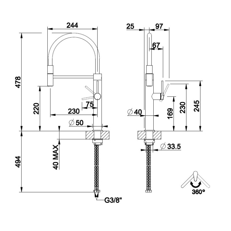 Μπαταρία νεροχύτη από ανοξείδωτο χάλυβα AISI 316 με αποσπώμενο ντους και υψηλό εύκαμπτο περιστρεφόμενο κατά 360 μοίρες ρουξούνι. Η νέα σειρά ημιβιομηχανικών προϊόντων από ανοξείδωτο χάλυβα αναδεικνύουν αυτό το πολύτιμο, μακράς διάρκειας, ανθεκτικό και αισθητικά ευχάριστο υλικό. Ενώ συνδυασμός του ανοξείδωτου χάλυβα με το καουτσούκ ακολουθεί τις τελευταίες τάσης της μόδας και του Interior Design.100% παραγωγή στην ΙΤΑΛΙΑ με πιστοποιημένη διαδικασία, βάση Ολοκληρωμένου Συστήματος Διαχείρισης Ποιότητας και Περιβάλλοντος. Διαθέτει αποσπώμενο ντους, οπή τοποθέτησης Ø33,5 mm, περιστρεφόμενο ρουξούνι 360°,μηχανισμός Ø25mm.