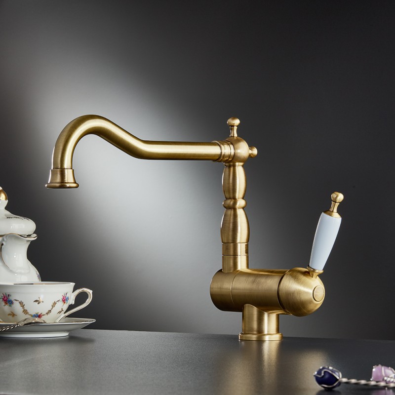 Μια αναμεικτική μπαταρία νεοκλασικού ξεκάθαρα σχεδιασμού σε Μπρονζέ φινίρισμα από τον Ιταλικό οίκο Bugnatese.Αρχοντικό design που συνδυάζει λευκή πορσελάνη με Μπρονζέ φινίρισμα για μια ρουστίκ vintage πινελιά. Διαθέτει περιστρεφόμενο ανακλινόμενο ρουξούνι, ιδανική για χρήση κάτω από ανοιγόμενο παράθυρο. Το Ύψος της Βρύσης είναι 29.9cm ενώ το ύψος της ροής του νερού είναι 21.8cm και έχει προβολή 24.2cm.