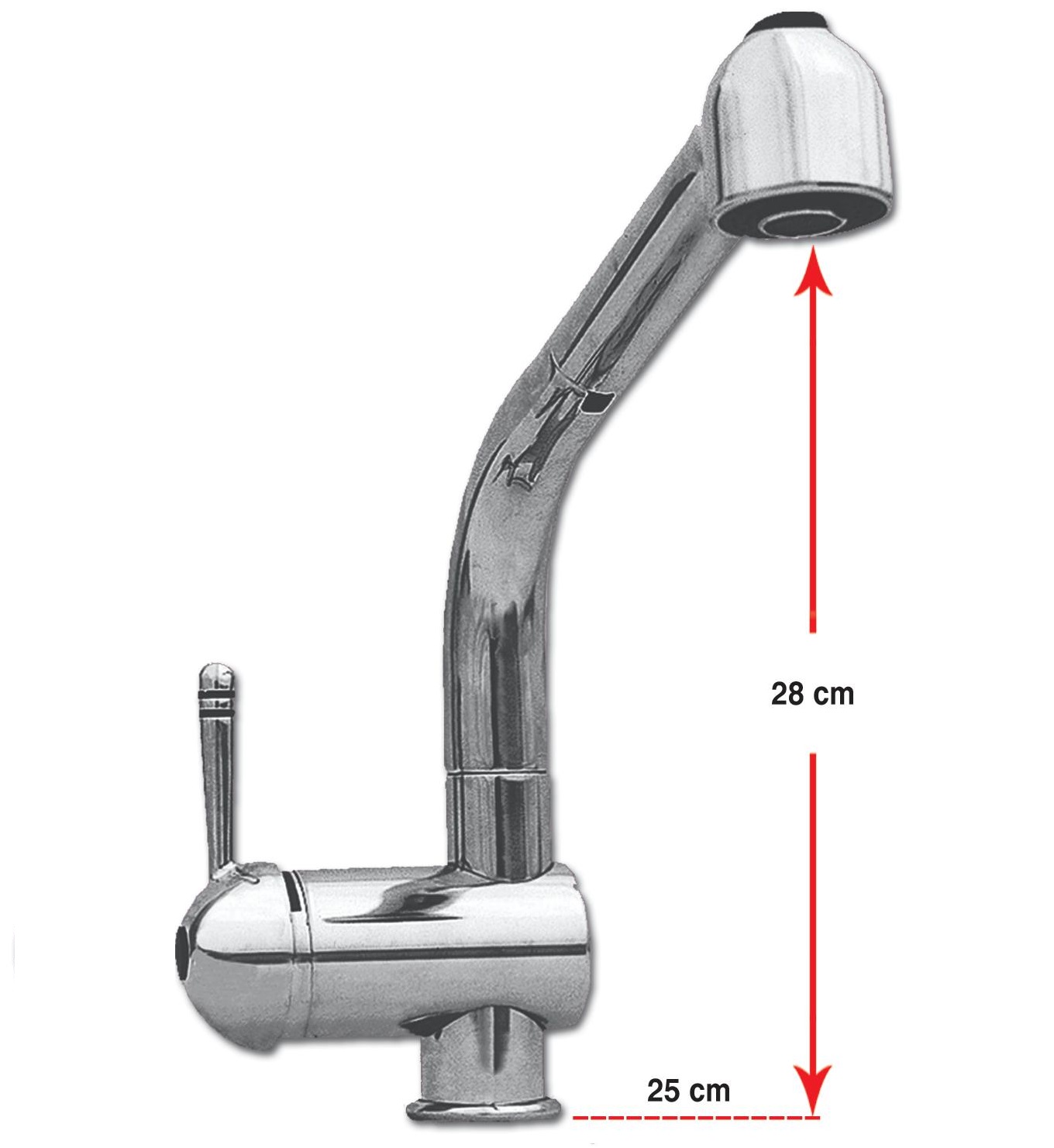 Αναμεικτική μπαταρία για τον πάγκο του νεροχύτη της κουζίνας με Σπιράλ & επεκτεινόμενο Ντους σε χρωμέ φινίρισμα.To Ολικό ύψος είναι 35cm ενώ το Ύψος της Ροής του νερού της Βρύσης είναι 28cm και η προβολή της είναι 25cm.Διαθέτει Σπιράλ σύνδεσης 40cm.