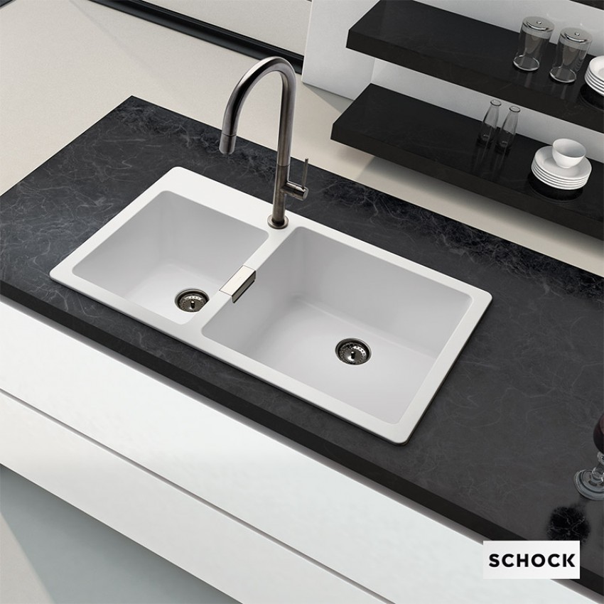 Γρανιτένιος ένθετος νεροχύτης του Γερμανικού οίκου Schock σε Λευκή απόχρωση (Polaris).Κατάλληλος για να εντοιχιστεί σε Ερμάριο 90cm.Διαθέτει εξωτερικές διαστάσεις 86x50cm με 2 γούρνες με διαστάσεις 45cm x 43cm x 21cm και 30.4cm x 36.5cm x 21cm.Διαθέτει νέα βελτιωμένη φόρμουλα Cristadur το οποίο καθιστά το προϊόν πιο ελαστικό, ανθεκτικότερο σε χτυπήματα και πιο εύκολο στον καθαρισμό του.