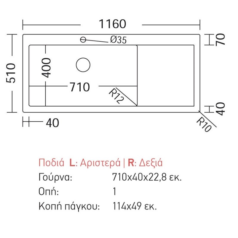 Ανοξείδωτος Ένθετος νεροχύτης του κατασκευαστή Fortinox με εξωτερικές διαστάσεις 116x51cm.Διαθέτει 1 αποστράγγιση και 1 γούρνα με Βάθος 22.8cm και Διάσταση Γούρνας 71x40cm. Ερμάριο 80cm.Κατασκευασμένος εξ 'ολοκλήρου από Ανοξείδωτο χάλυβας 18/10 και φινίρισμα Satin Λείο. Συμπεριλαμβάνονται βαλβίδες, σωληνώσεις & λιποσυλλέκτης.