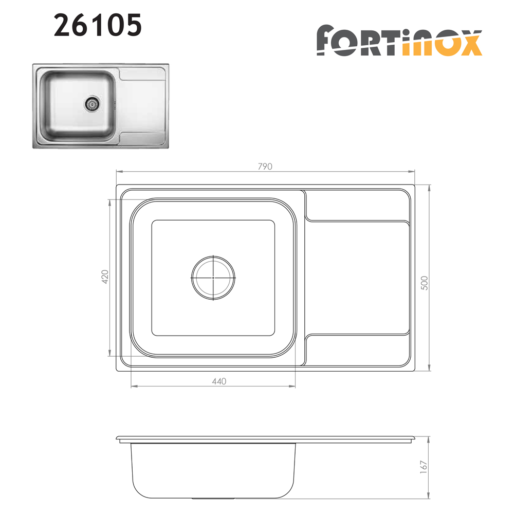 Νεροχύτης Valley 26105 της εταιρείας Fortinox, κατασκευασμένος από ανοξείδωτο ατσάλι. Έχει εξωτερικές διαστάσεις 79x50cm. Διαθέτει μια γούρνα με εσωτερικές διαστάσεις 42x44cm 16.7cm βάθος καθώς και 1 ποδιά αποστράγγιση. Είναι ανθεκτικός στη σκουριά και τη θερμότητα, ενώ παράλληλα έχει μεγάλη αντοχή σε ισχυρά οξέα όπως το νιτρικό οξύ, σε αλκαλικά διαλύματα καθώς και σε διαλύματα οργανικών και ανόργανων αλάτων. Επίσης αποτρέπει την εμφύτευση και επιβίωση βακτηριδίων.