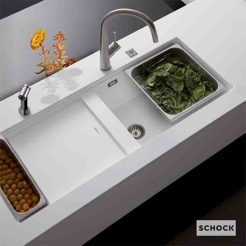Γρανιτένιος Υποκαθήμενος νεροχύτης του Γερμανικού οίκου Schock σε Λευκή απόχρωση (Polaris).Κατάλληλος για να εντοιχιστεί σε Ερμάριο 120cm.Διαθέτει εξωτερικές διαστάσεις 114x46cm με 1 μεγάλη γούρνα με διαστάσεις 50.9cm x 38.4cm x 23cm και 1 μικρή γούρνα με διαστάσεις 13.3cm x 38.4cm x 14cm.Διαθέτει νέα βελτιωμένη φόρμουλα Cristadur το οποίο καθιστά το προϊόν πιο ελαστικό, ανθεκτικότερο σε χτυπήματα και πιο εύκολο στον καθαρισμό του. Ο νεροχύτης είναι κατάλληλος μόνο για μπαταρία πάγκου ή τοίχου.
