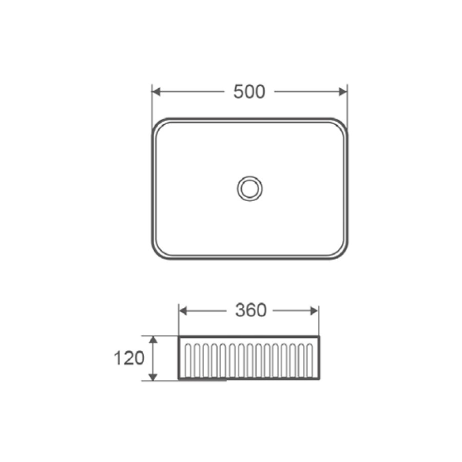 Μοντέρνος τετράγωνος νιπτήρας επικαθήμενος σε Λευκό φινίρισμα από υλικό κατασκευής πορσελάνη με περιμετρικό γραμμωτό σχέδιο και διαστάσεις 50 x 36 x 12cm.  Η αγορά του εν λόγω νιπτήρα απαιτεί την χρήση εντοιχισμένης ή ψηλής μπαταρίας πάγκου που θα βρείτε στα σχετικά προϊόντα.