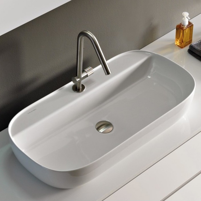 Υπερπολυτελής Νιπτήρας μπάνιου Επικαθήμενος σε Λευκό φινίρισμα της Ιταλικής εταιρίας Scarabeo.Το υλικό κατασκευής του είναι άριστης ποιότητάς ατόφια πορσελάνη. Έχει εξωτερικές διαστάσεις 76cm x 39cm, είναι χωρίς υπερχείλιση και έχει ολικό βάθος γούρνας 14cm ενώ χωρίς υπερχείλιση 11cm.Διαθέτει και 1 οπή για μπαταρία.