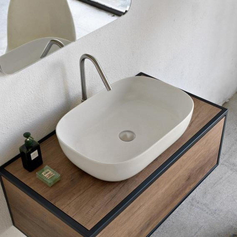 Υπερπολυτελής Νιπτήρας μπάνιου Επικαθήμενος σε Λευκό Ματ φινίρισμα της Ιταλικής εταιρίας Scarabeo.Το υλικό κατασκευής του είναι άριστης ποιότητάς ατόφια πορσελάνη. Έχει εξωτερικές διαστάσεις 56cm x 39cm, είναι χωρίς υπερχείλιση και έχει βάθος γούρνας 14cm ενώ χωρίς υπερχείλιση 11cm