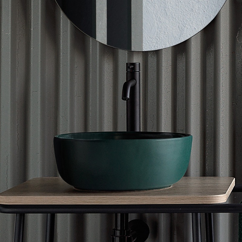 Υπερπολυτελής Νιπτήρας μπάνιου Επικαθήμενος σε Musk Πράσινο φινίρισμα της Ιταλικής εταιρίας Scarabeo.Το υλικό κατασκευής του είναι άριστης ποιότητάς ατόφια πορσελάνη. Έχει διάμετρο Φ.39cm, είναι χωρίς υπερχείλιση και έχει βάθος γούρνας 14cm ενώ χωρίς υπερχείλιση 10cm.