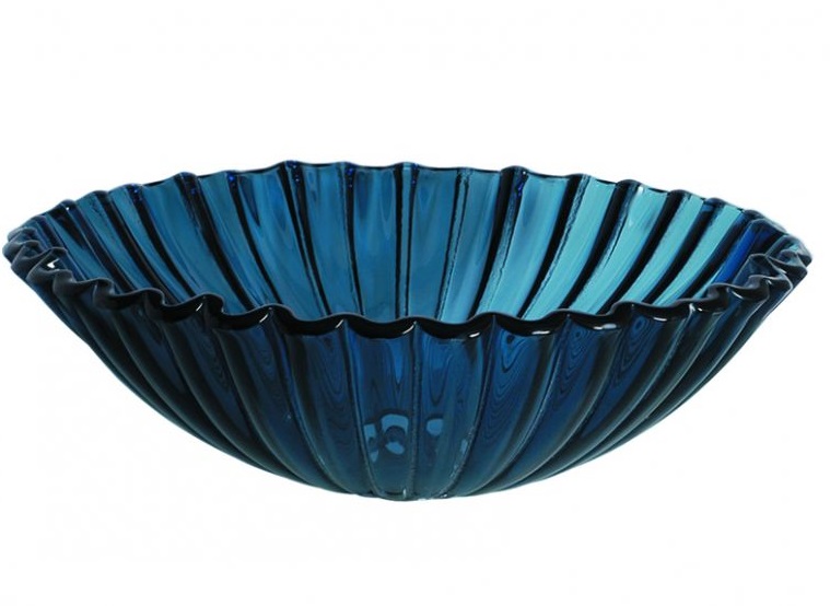 Γυάλινος Νιπτήρας επικαθήμενος σε μπλε φινίρισμα με διαστάσεις 42 x 42 x 14.5 cm.