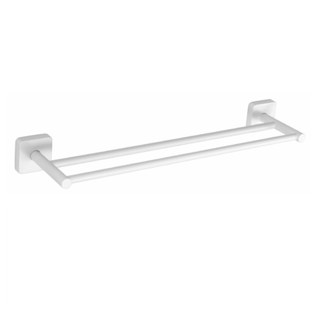 Πετσετοκρεμάστρα διπλή για πετσέτες μπάνιου σε Λευκό Ματ φινίρισμα κατασκευασμένο εξ ολοκλήρου από Ανοξείδωτο ατσάλι χάλυβα άριστης ποιότητας Inox 304 & 18/10.Το αξεσουάρ μπορεί να τοποθετηθεί με ταινία 3M που κρατάει βάρος μέχρι 1Kg ή βιδωτά. Συμπαγή και στέρεο προϊόν, φτιαγμένο για παντοτινή χρήση 100% στέρεο υλικό με τέλειο φινίρισμα καθρέφτη χωρίς γαλβανική επίστρωση. Έχει Διαστάσεις: 50 x 5.5 x 11.5 cm.