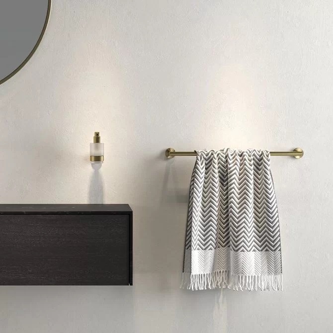 Πετσετοθήκη μονή για πετσέτες μεγάλες σώματος μπάνιου σε Χρυσό Βουρτσισμένο φινίρισμα από τον Ολλανδικό οίκο Geesa κατασκευασμένο εξολοκλήρου από 100% Inox.Απλός και απέριττος κυλινδρικός σχεδιασμός που ταιριάζει μοναδικά σε κάθε μπάνιο. Έχει Ολικό Μήκος 64.8cm και Μήκος Βέργας 60cm.