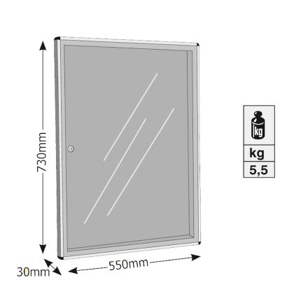 Παραλληλόγραμμος πίνακας ανακοινώσεων με διάφανο πορτάκι πλευρικού ανοίγματος και ενσωματωμένη κλειδαριά.Η συγκράτηση γίνεται μαγνητικά και είναι Ιδανικό για κόλλες Α.4.Έχει διαστάσεις 73cm (ύψος) x 55cm (πλάτος) x 3cm (βάθος).Διατίθεται σε Ασημί χρώμα.