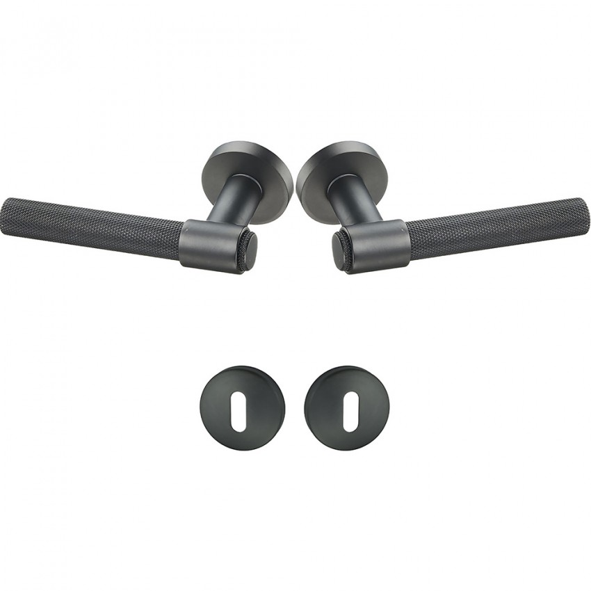 Ένα πόμολο πόρτας πρωτοποριακού industrial σχεδιασμού με Κανελάζ λεπτομέρεια στην χειρολαβή του και Ανθρακί ματ φινίρισμα. Το επαναλαμβανόμενο μοτίβο ακρίβειας στην χειρολαβή του θα αποκορυφώσει αισθητικά την οποιαδήποτε επιφάνεια αναβαθμίζοντας την αισθητική ολόκληρου του χώρου συνολικότερα.
