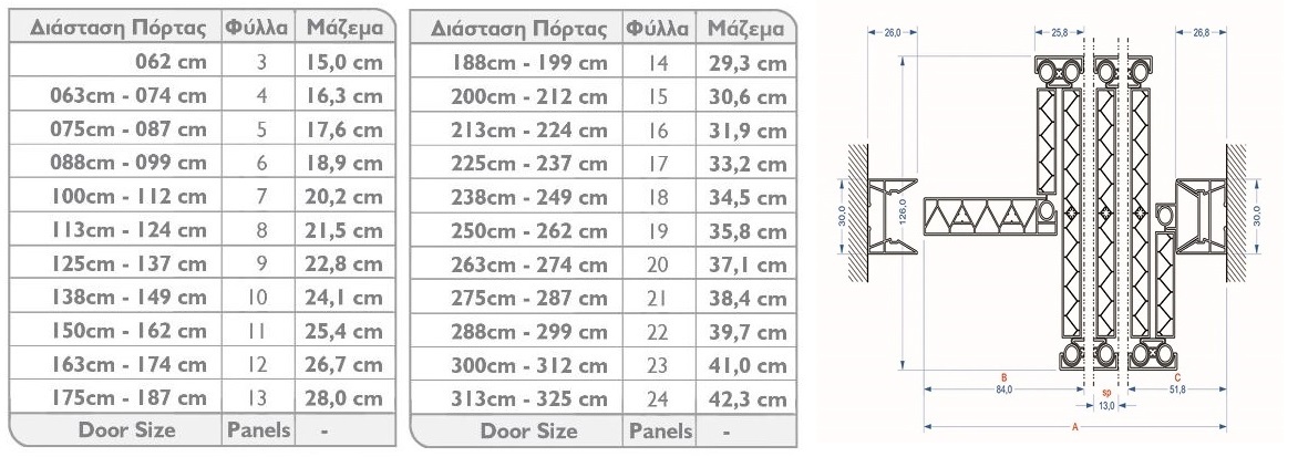 Ο παρακάτω πίνακας σας δείχνει αναλυτικά τον χώρο τον οποίο ''πιάνουν'' τα φύλλα της πόρτας όταν είναι διπλωμένα ανά διάσταση.