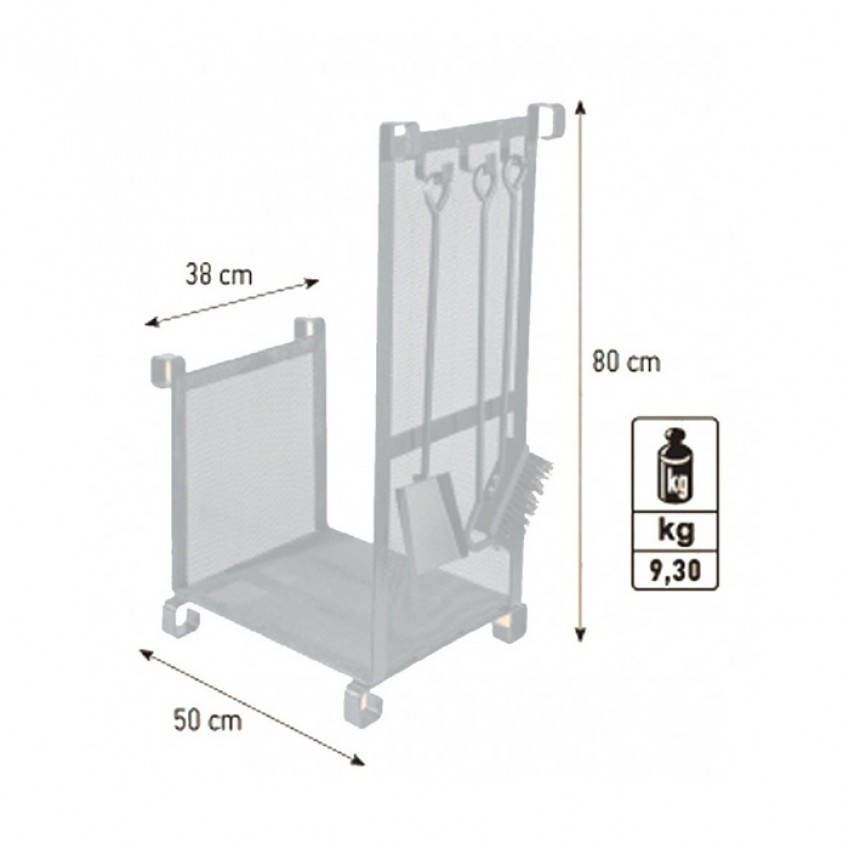 Διατηρείστε ένα καθαρό και τακτοποιημένο τζάκι με μια πρωτότυπη ξυλιέρα από την Viometal. Εξοπλισμένη με τρία εργαλεία για το τζάκι τα οποία τοποθετούνται πάνω σε ειδικά γαντζάκια για άμεση πρόσβαση σε αυτά. Έχει Διαστάσεις Μήκος: 50cm Ύψος: 80cm Πλάτος: 38cm και Βάρος: 9.30kg
