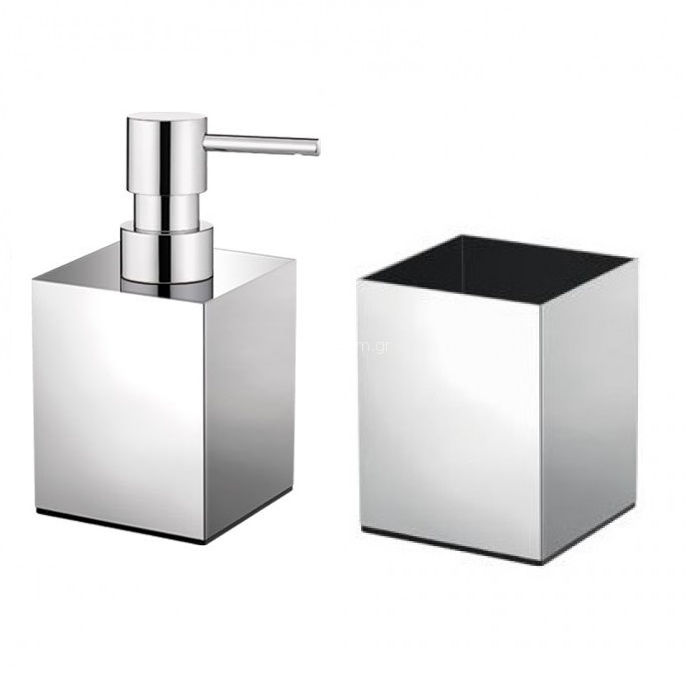 Σετ Ντισπένσερ με Ποτηροθήκη κατασκευασμένο από ορείχαλκο σε Χρώμιο Γυαλιστερό Φινίρισμα.Έχουν Διαστάσεις 16cm (Ύψος) x 9cm (Πλάτος) και 10.5cm (Ύψος) x 7cm (Πλάτος) αντίστοιχα.