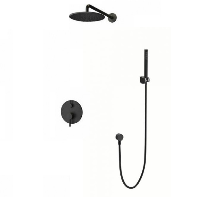 Σετ ντουζ εντοιχισμού σε Μαύρο Ματ φινίρισμα. Το σετ περιλαμβάνει τον μίκτη εντοιχισμού 2 εξόδων, Κεφαλή φ.22cm με Επιτοίχιο μπράτσο καθώς και παροχή νερού, Σπιράλ και Τηλέφωνο χειρός με βάση στήριξης.