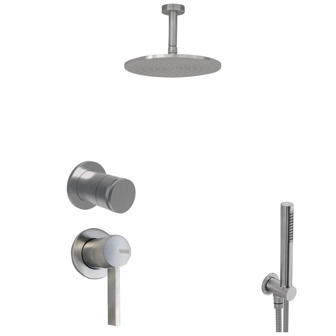 Σετ εντοιχισμού ντουζιέρας του ιταλικού Οίκου Armando Vicario. Περιλαμβάνει Μίκτη εντοιχισμού με ξεχωριστό περιστροφικό εκτροπέα 2 εξόδων, Ανακλινόμενη Κεφαλή ντουζ Φ.20 ή Φ.30 Abs με βραχίονα οροφής 10cm, Στήριγμα τηλεφώνου με παροχή νερού, τηλέφωνο και σπιράλ σύνδεσης pvc. Διατίθεται σε Ανοξείδωτο Ματ φινίρισμα.
