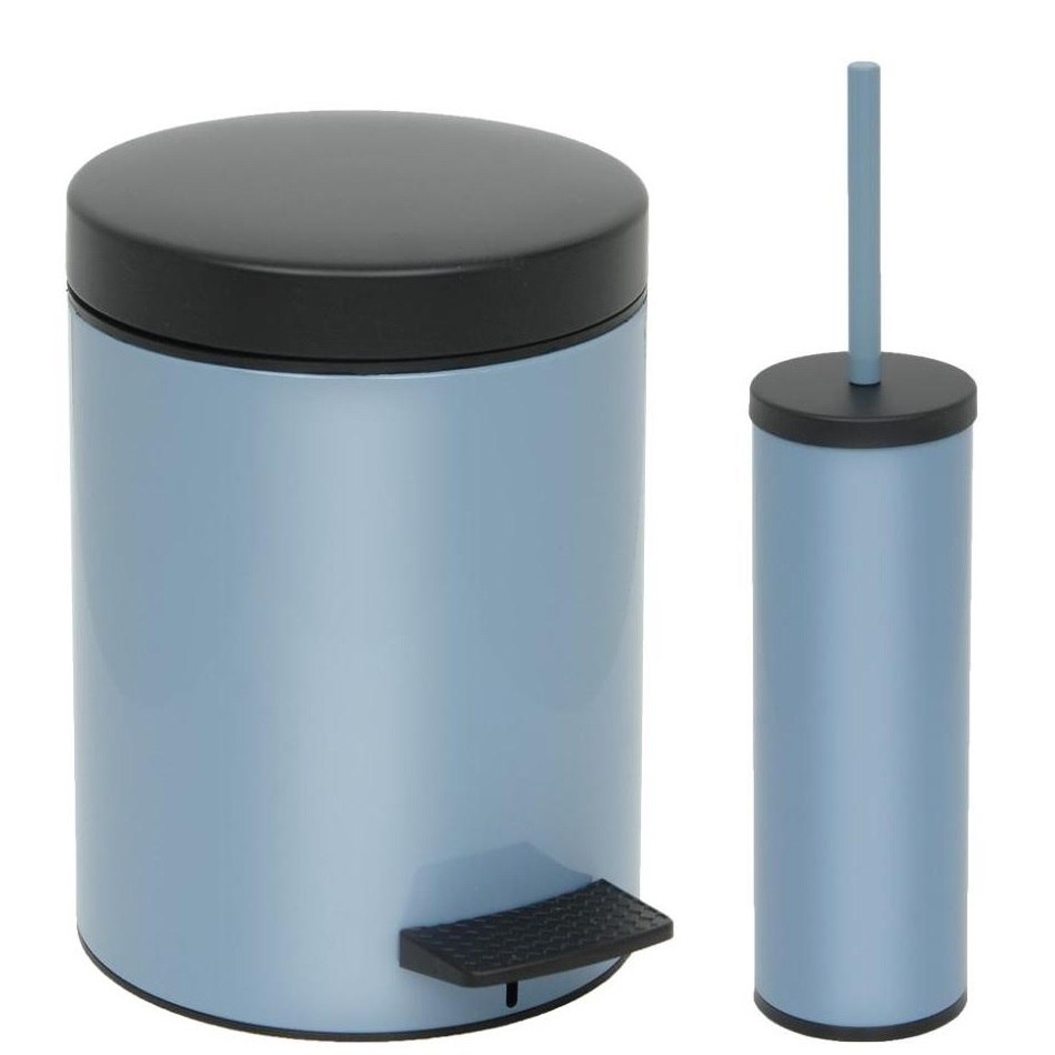 Κάδος απορριμμάτων Σετ με πιγκάλ μπάνιου σε Σιέλ με Μαύρο Φινίρισμα.Ο κάδος έχει χωρητικότητα 5 λίτρων με διαστάσεις 20cm (διάμετρος) x 28cm (ύψος) ενώ διαθέτει ανθεκτικό μηχανισμό με πεντάλ για το άνοιγμα του.Το πιγκάλ έχει διαστάσεις 8cm (διάμετρος) x 37cm (ύψος).Τα 2 αξεσουάρ του σετ διαθέτουν εσωτερική πλαστική επένδυση που αφαιρούνται εύκολα για καθαρισμό τους.Δυνατότητα προσθήκης της διεθνής πατέντας Soft Close στο καπάκι του, η οποία διαθέτει μηχανισμούς και ελάσματα τα οποία επιτρέπουν το ομαλό αθόρυβο κλείσιμο του καπακιού του χαρτοδοχείου.