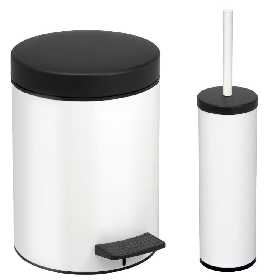 Κάδος απορριμμάτων Σετ με πιγκάλ μπάνιου σε άσπρο με μαύρο Φινίρισμα.Ο κάδος έχει χωρητικότητα 5 λίτρων με διαστάσεις 20cm (διάμετρος) x 28cm (ύψος) ενώ διαθέτει ανθεκτικό μηχανισμό με πεντάλ για το άνοιγμα του.Το πιγκάλ έχει διαστάσεις 8cm (διάμετρος) x 37cm (ύψος).Τα 2 αξεσουάρ του σετ διαθέτουν εσωτερική πλαστική επένδυση που αφαιρούνται εύκολα για καθαρισμό τους.Δυνατότητα προσθήκης της διεθνής πατέντας Soft Close στο καπάκι του, η οποία διαθέτει μηχανισμούς και ελάσματα τα οποία επιτρέπουν το ομαλό αθόρυβο κλείσιμο του καπακιού του χαρτοδοχείου.