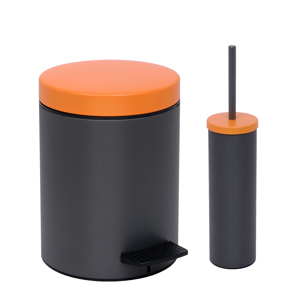 Κάδος απορριμμάτων Σετ με πιγκάλ μπάνιου σε Ανθρακί με πορτοκαλί Φινίρισμα.Ο κάδος έχει χωρητικότητα 5 λίτρων με διαστάσεις 20cm (διάμετρος) x 28cm (ύψος) ενώ διαθέτει ανθεκτικό μηχανισμό με πεντάλ για το άνοιγμα του.Το πιγκάλ έχει διαστάσεις 8cm (διάμετρος) x 37cm (ύψος).Τα 2 αξεσουάρ του σετ διαθέτουν εσωτερική πλαστική επένδυση που αφαιρούνται εύκολα για καθαρισμό τους.Δυνατότητα προσθήκης της διεθνής πατέντας Soft Close στο καπάκι του, η οποία διαθέτει μηχανισμούς και ελάσματα τα οποία επιτρέπουν το ομαλό αθόρυβο κλείσιμο του καπακιού του χαρτοδοχείου.