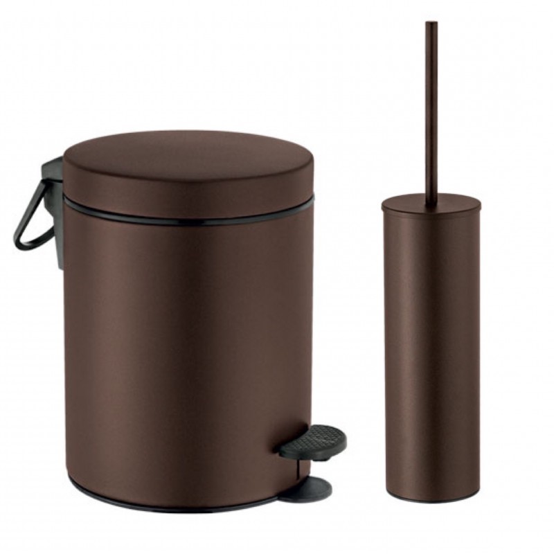 Κάδος απορριμμάτων Σετ με Πιγκάλ μπάνιου σε Καφέ Wenge Φινίρισμα. Ο κάδος έχει χωρητικότητα 5 λίτρων με διαστάσεις 20cm (διάμετρος) x 28cm (ύψος) ενώ διαθέτει ανθεκτικό μηχανισμό με πεντάλ για το άνοιγμα του. Το Πιγκάλ έχει διαστάσεις 8cm (διάμετρος) x 37cm (ύψος).Τα 2 αξεσουάρ του σετ διαθέτουν εσωτερική πλαστική επένδυση που αφαιρούνται εύκολα για καθαρισμό τους. Προσθήκης της διεθνής πατέντας Soft Close στο καπάκι του, η οποία διαθέτει μηχανισμούς και ελάσματα τα οποία επιτρέπουν το ομαλό αθόρυβο κλείσιμο του καπακιού του χαρτοδοχείου.