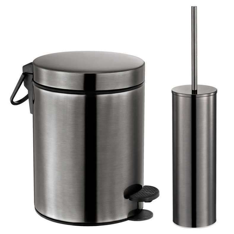 Κάδος απορριμμάτων Σετ με Πιγκάλ μπάνιου σε Gun Metal Brushed Φινίρισμα. Ο κάδος έχει χωρητικότητα 5 λίτρων με διαστάσεις 20cm (διάμετρος) x 28cm (ύψος) ενώ διαθέτει ανθεκτικό μηχανισμό με πεντάλ για το άνοιγμα του. Το Πιγκάλ έχει διαστάσεις 8cm (διάμετρος) x 37cm (ύψος).Τα 2 αξεσουάρ του σετ διαθέτουν εσωτερική πλαστική επένδυση που αφαιρούνται εύκολα για καθαρισμό τους. Προσθήκη της διεθνής πατέντας Soft Close στο καπάκι του, η οποία διαθέτει μηχανισμούς και ελάσματα τα οποία επιτρέπουν το ομαλό αθόρυβο κλείσιμο του καπακιού του χαρτοδοχείου.