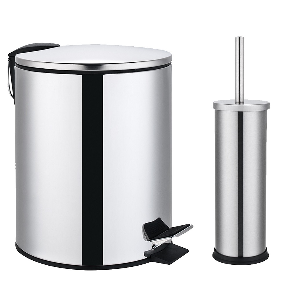 Κάδος απορριμμάτων Σετ με Πιγκάλ μπάνιου σε Ανοξείδωτο Γυαλιστερό φινίρισμα. Ο κάδος έχει χωρητικότητα 5 λίτρων με διαστάσεις 20cm (διάμετρος) x 28cm (ύψος) ενώ διαθέτει ανθεκτικό μηχανισμό με πεντάλ για το άνοιγμα του. Το Πιγκάλ έχει διαστάσεις 9.5cm (διάμετρος) x 38cm (ύψος).Τα 2 αξεσουάρ του σετ διαθέτουν εσωτερική πλαστική επένδυση που αφαιρούνται εύκολα για καθαρισμό τους.