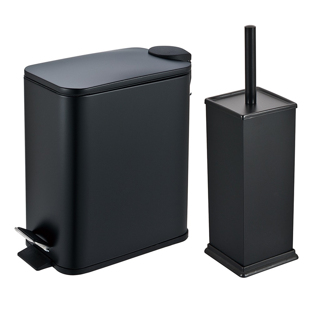 Πιγκάλ και χαρτοδοχείο με πεντάλ 5 λίτρων σε μαύρο χρώμα. Μοντέρνο και διαχρονικό design που ταιριάζει μοναδικά σε κάθε μπάνιο προσδίδοντας του ένα ιδιαίτερο στυλ. Ιδανική λύση και για μπάνια με περιορισμένο χώρο. Οι διαστάσεις του χαρτοδοχείο είναι :28 μήκος 14 πλάτος: 30 ύψος και του Πιγκάλ μήκος: 9 πλάτος: 9 ύψος: 38