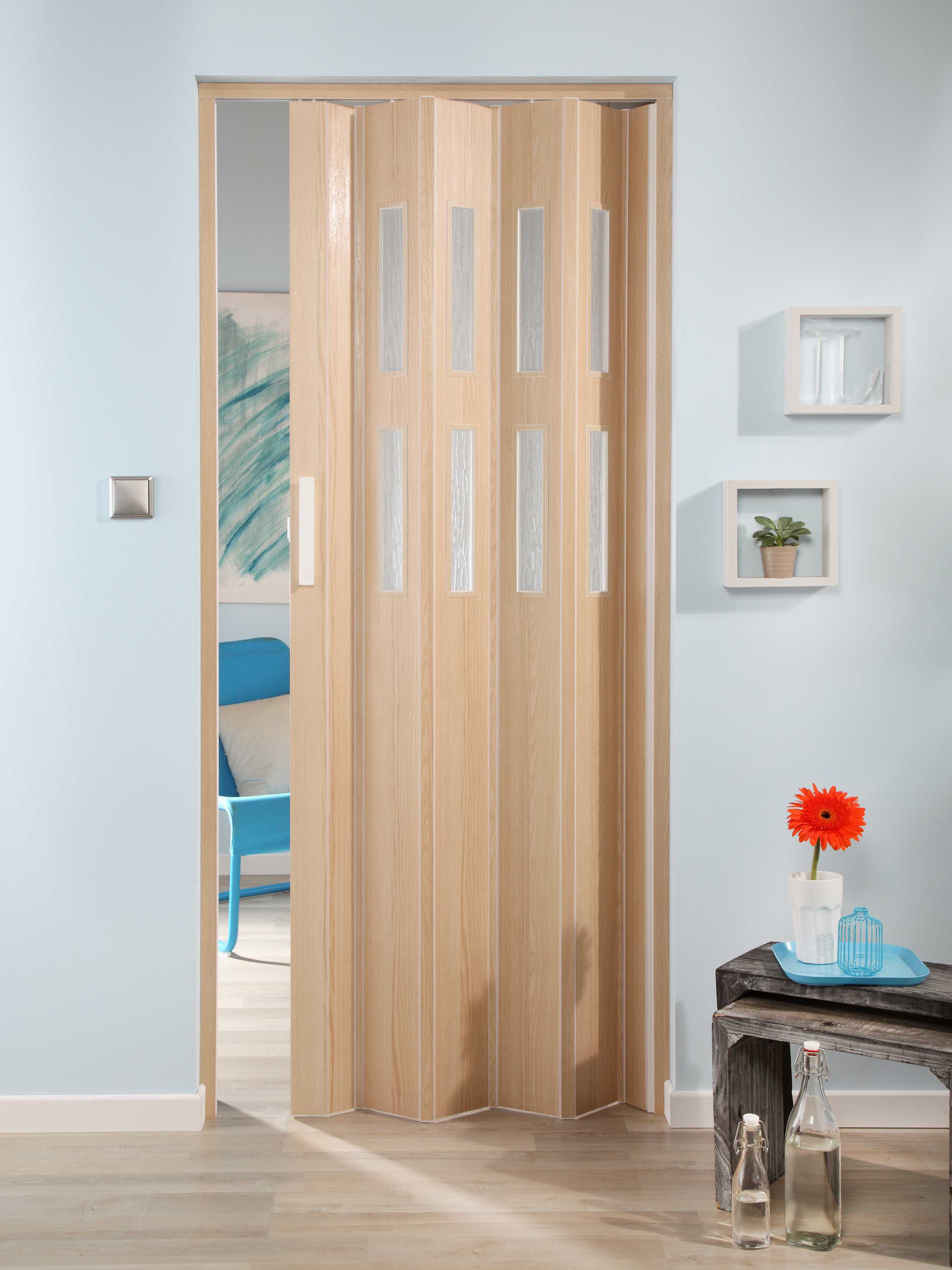 Σφυρήλατη Πτυσσόμενη πόρτα φυσούνα σε χρώμα 3D Ξύλο Οξιάς με 2 σειρές τζαμιών καταρράκτη. Η πόρτα διατίθεται με Ύψος μέχρι 222cm.Επιλέξτε οποιαδήποτε διάσταση ταιριάζει στις δικές σας ανάγκες και γράψτε μας στις πληροφορίες της παραγγελίας σας την ακριβής διάσταση (Πλάτος και Ύψος) που θέλετε να κατασκευάσουμε την πόρτα