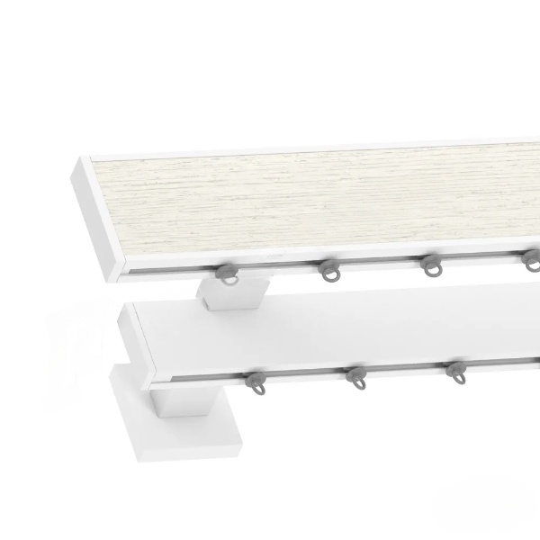 Σιδηρόδρομος πολυτελείας αλουμινίου, πλακέ σχήματος με πάχος 6cm σε Λευκό Ματ φινίρισμα με μεταλλικές τάπες & τετράγωνα στηρίγματα. Στην πρόσοψη του σιδηροδρόμου έχει προστεθεί ένθετο ξύλο λευκής απόχρωσης με σκοπό την ακραία χρωματική αντίθεση. Πρωτοποριακό design που αναδεικνύει και την παραμικρή λεπτομέρεια του εσωτερικού σας χώρου, διαθέσιμο σε μονό ή διπλό σιδηρόδρομο με αντίστοιχα στηρίγματα στήριξης με απόσταση από τον τοίχο 12cm (στο μονό) ή 16cm (στο διπλό). Σε περίπτωση επιλογής διπλού ο 2ος σιδηρόδρομος διαθέτει πλακέ προφίλ, και λευκού χρώματος.