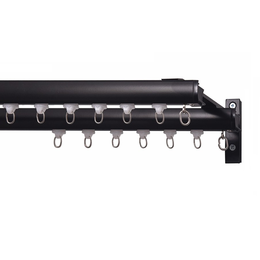 Σιδηρόδρομος κρέμασης κουρτινών μοντέρνας γραμμής σε κυλινδρικό design σε Μαύρο Ματ φινίρισμα. Έχει προφίλ φ.25 και διαθέτει μεταλλικά στηρίγματα για μονή ή διπλή κουρτίνα αναλόγως την επιλογή .Υπάρχει η δυνατότητα επιλογής πολλών διαφορετικών διαστάσεων από 1.00 μέτρο έως και 3.40 μέτρα .Διατίθεται κατόπιν ζήτησης του πελάτη με ειδικά στηρίγματα οροφής.