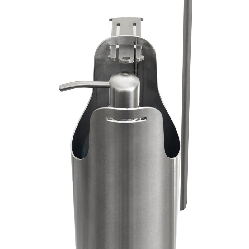 Σταντ με πεντάλ και περιλαμβανόμενο δοχείο με αντλία της εταιρείας. Ιδανικό για χρήση αντισηπτικού χεριών χωρίς επαφή με το Ντισπένσερ, απλώς πατώντας το πεντάλ με το πόδι. Είναι κατασκευασμένο από inox AISI 304 ανθεκτικό στη διάβρωση χωρίς ραφή κλεισίματος (βαρέως τύπου). Δυνατότητα να βιδωθεί στο έδαφος. Δυνατότητα κλειδώματος της ασφάλειας για την αποφυγή κλοπής του αντισηπτικού. Ειδικός ρυθμιστής ύψους στο εσωτερικό της συσκευής για να δέχεται μπουκάλι αντισηπτικού οποιουδήποτε ύψους. Τα προϊόντα χρήσης που ενδείκνυνται για τον καθαρισμό του είναι απαλές κρέμες ή αφροί ή σαπουνάδα, με ουδέτερα PH, εφαρμόζοντας ένα λεπτό στρώμα του καθαριστικού με ένα βαμβακερό ύφασμα. Διαστάσεις: διάμετρος βάσης 30εκ., διάμετρος σωλήνα 10εκ. και ύψος 111,5εκ. Βάρος συσκεύης 8kg. Κατασκευάζεται στην Ελλάδα. Διαστάσεις: 30x30x111.5cm