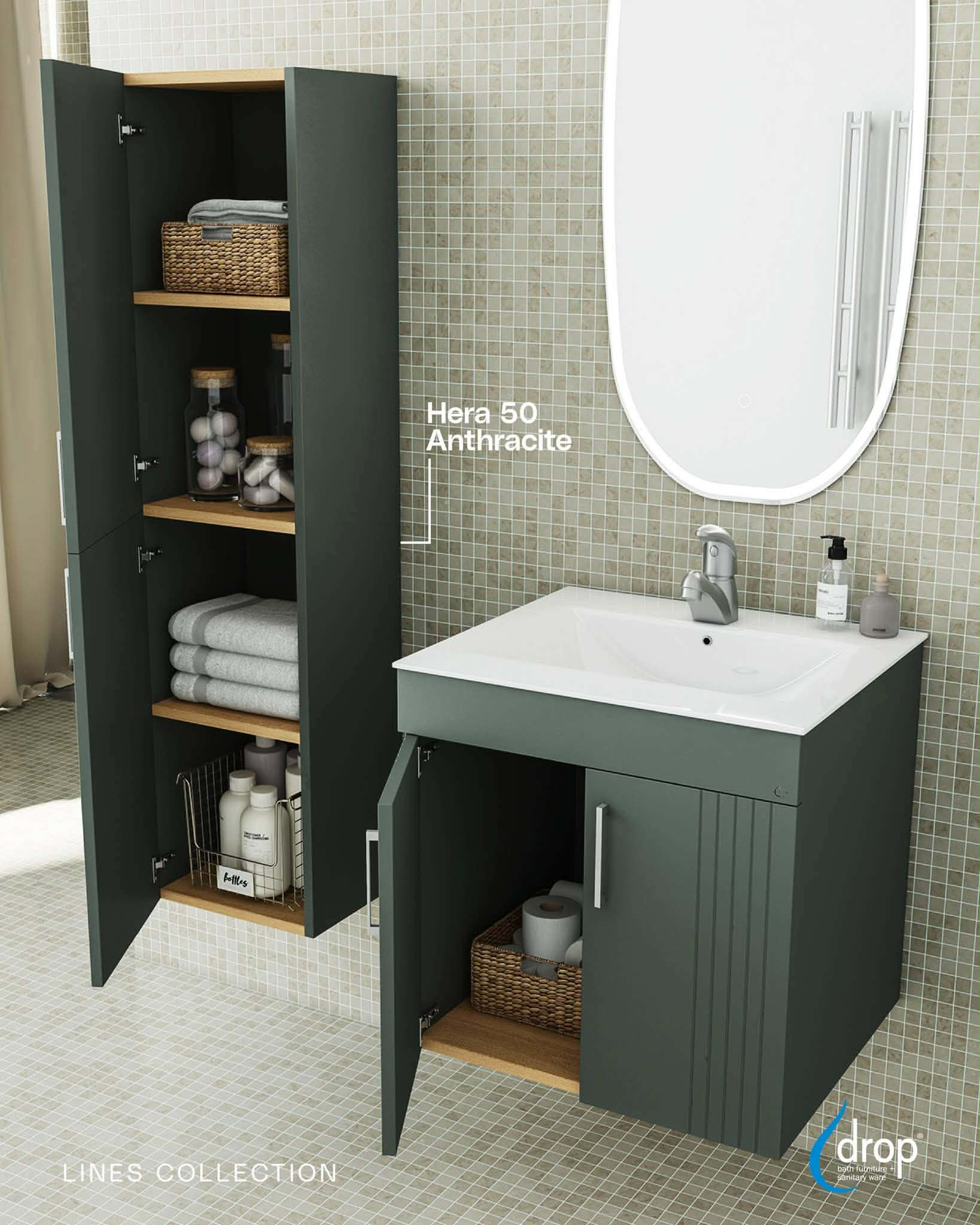 Κρεμαστή Στήλη μπάνιου με 2 ντουλάπια και 2 αποθηκευτικούς χώρους με μηχανισμό soft close σε νέα γκρι ανθρακί απόχρωση  και αυλακωτή λεπτομέρεια στην άκρη του ντουλαπιού για ένα απαράμιλλο design.Ένα έπιπλο που προσελκύει τα βλέμματα με τις κομψές γραμμές του αποπνέοντας πολυτέλεια και κομψότητα. . Έχει διαστάσεις 30cm(πλάτος) x26cm (προβολή από τοίχο) x120cm (ύψος).