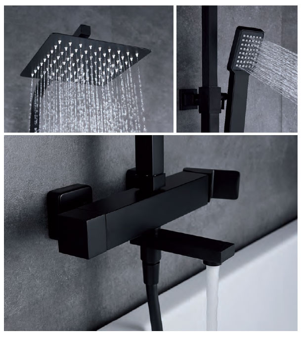 Στήλη Ντους με Μπαταρία 3 εξόδων σε Μαύρο Ματ φινίρισμα .Διαθέτει κεραμικό δίσκο 35mm, ανακλινόμενη Κεφαλή ντουζιέρας 20cm με βραχίονα τοίχου ,τηλεσκοπική κολόνα με αυξομειώμενο ύψος 116cm έως 160cm, Ανοξείδωτη τετράγωνη αναμεικτική μπαταρία με εκτροπέα 3 θέσεων, για τηλέφωνο, στόμιο  και κεφαλή και τετράγωνο χερούλι για ρύθμιση της θερμοκρασίας και ρύθμισης του νερού καθώς και τηλέφωνο χειρός από πλαστικό pvc με ρυθμιζόμενη βάση στήριξης καθώς και Σπιράλ 150cm.Μέγιστη  αντοχή στην φθορά και στην οξείδωση.
