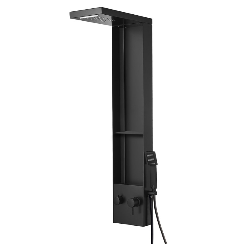 Μια νέα κατεξοχήν μοντέρνου σχεδιασμού Μαύρη Ματ Στήλη Υδρομασάζ. Μια κυριολεκτικά επιβλητική επιλογή ικανή να αποκορυφώσει και να αλλάξει τον ''αέρα'' οποιουδήποτε μπάνιου. Είναι κατασκευασμένη εξολοκλήρου από άριστης ποιότητας αλουμίνιο για μέγιστη αντοχή στην φθορά και στην οξείδωση ενώ διαθέτει 3 συστοιχίες jet,διανομέα 3 λειτουργιών, Κεφαλή ντουζ & καταρράκτη καθώς και Τηλέφωνο με Σπιράλ σε Μαύρο Ματ.