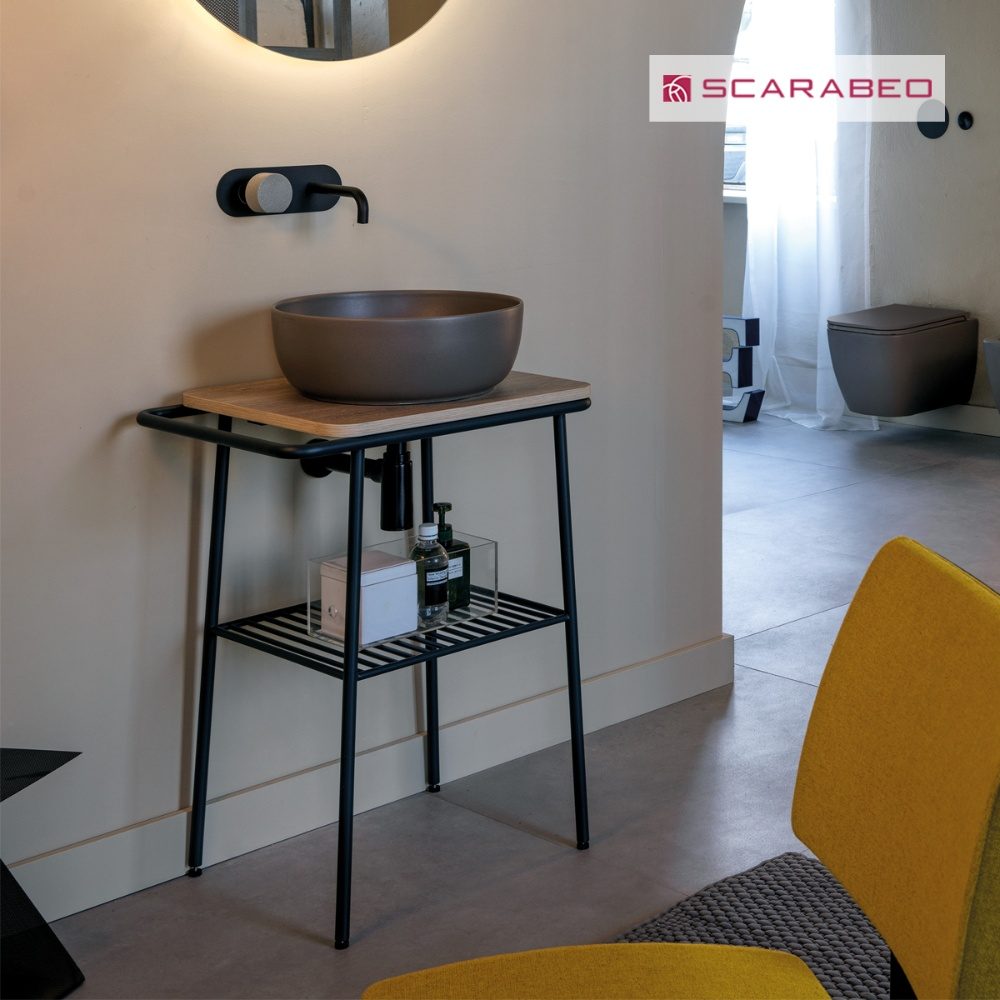 Με πάθος για το αυθεντικό ''Made in Italy'' η Scarabeo δημιούργησε αυτήν την μοναδική σειρά επίπλου που έχει καταφέρει να παντρέψει το σύγχρονο με το κλασσικό. Το έπιπλο συνδυάζει μεταλλικό σκελετό σε μαύρο ματ φινίρισμα με ξύλινη βάση σε χρώμα rovere nodato για την υποδοχή επικαθήμενου νιπτήρα. Διαθέτει πλαϊνή πετσετοκρεμάστρα καθώς και 1 ράφι, έχει διαστάσεις 77cm (Ύψος) x 59cm (Πλάτος) x 45cm (Προεξοχή από τον τοίχο)