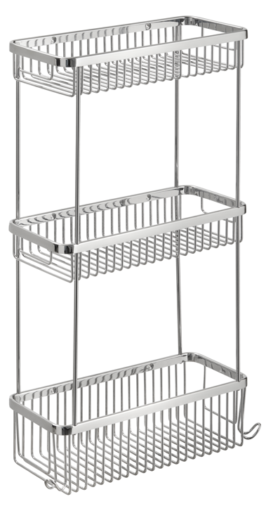 Σπογγοθήκη τριπλή σε Χρώμιο Γυαλιστερό φινίρισμα από 100% ορείχαλκο υλικό κατασκευής για μέγιστη αντοχή στην φθορά και στην οξείδωση. Μοντέρνο και διαχρονικό design που θα ταιριάξει μοναδικά σε κάθε μπάνιο. Διαθέτει και 2 ενσωματωμένα άγκιστρα για το κρέμασμα διαφόρων αξεσουάρ μπάνιου όπως σφουγγάρια. Έχει διαστάσεις 32cm (Πλάτος) x 54 (Ύψος) x 12cm (Προεξοχή από τον τοίχο)